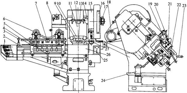 图4-10-3 自动冲盖机结构图 1-板条输送器 2-送料架 3-送料盖板开启手柄 4-储料架 5-贮料架手柄 6-塑料软管 7-分张磁铁块 8-润滑油表 9-上冲模 10-滑块 11-有机玻璃 12-连杆 13-打盖器 14-曲轴 15-离合器 16-皮带轮罩活门 17-手动盘车法兰 18-电动机 19-真空吸嘴 20-刮料爪 21-托料爪 22-送料架调节螺钉 23-离合器操纵手柄 24-润滑油泵 25-电动操纵箱 26-机身工作台 27-排出废料辊筒 28-机身 29-真空泵 在机身上装有各类机构和组件:机身左侧的送料架2上装有贮料架4、刮料机构的刮料爪20、用于输送条料至上下模冲盖的板条输送器1;机身中部上面装有曲轴14、连杆12、工作台26等,机身右侧主要有电机18、离合器15、排出废料辊27等,与之配套的仪表、自动化电气装置也装在机身上。 (三)主要技术参数 几种自动冲盖机的主要技术参数见表4-10-2。 表4-10-2 几种自动冲盖机主要技术参数