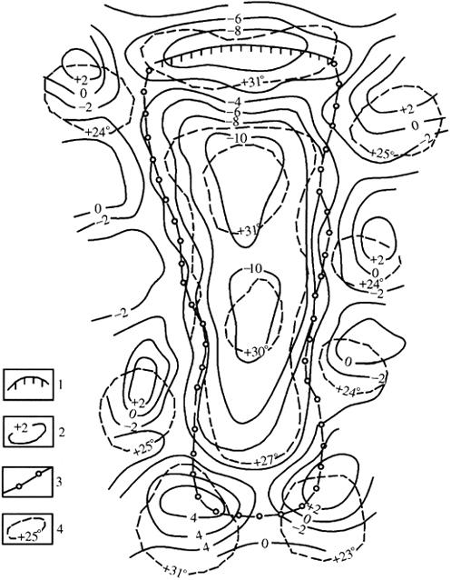 | 释义 | 自然电位法、测温法滑坡体调查 图2-1是自然电位法测量阿德勒城附近一个小型活动滑坡的结果。由于滑动带内的地下水由滑坡体后缘向前缘渗透,在滑坡体位置上出现明显的带状分布的自然电位负异常,负异常极大值大于-10mV。带状异常中心位置对应于滑坡体的对称轴,沿带状负异常周围分布的等位线密集带大致反映出滑坡体边界。滑坡体前缘出现的负异常是由于滑动带内地下水渗入断层后,向地面方向渗透所致。