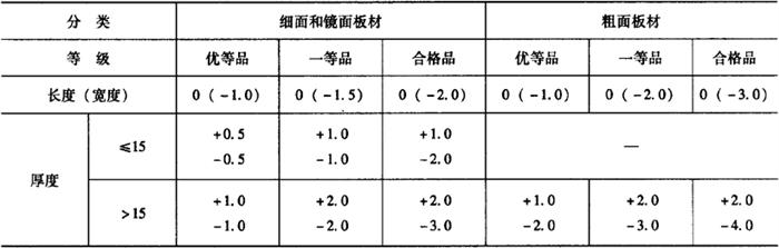 (四)天然花岗石板材的质量标准 1.规格尺寸允许偏差 天然花岗石板材的规格尺寸允许偏差,随着板材表面加工程度不同而不同。普型板材的规格尺寸允许偏差,应符合表15-12中的规定。异型板材的规格尺寸允许偏差,由供需双方协商确定。 表15-12 普型板材的规格尺寸允许偏差 (mm)