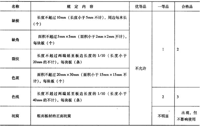 4.外观质量要求 同一批花岗石板材的色调花纹应基本一致,差别不得明显。其正面的外观缺陷,应符合表15-15中的规定。 表15-15 天然花岗石板材正面外观缺陷要求
