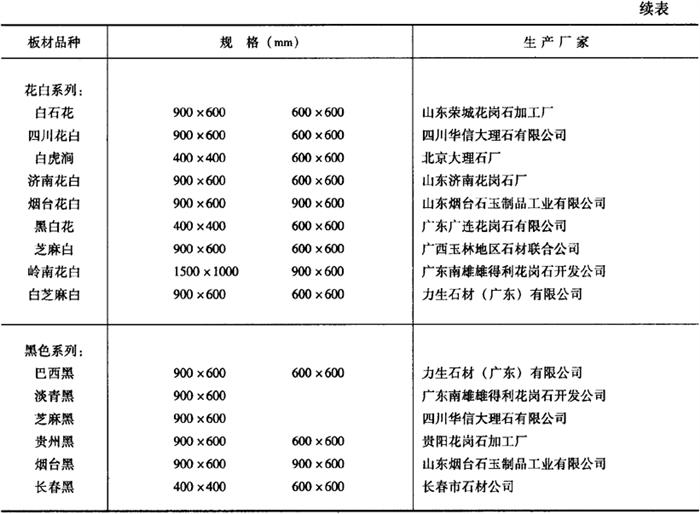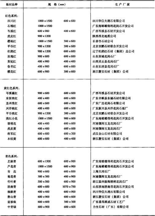 (五)建筑装饰工程所用花岗岩板材 由于我国天然花岗岩资源非常丰富,所以花岗岩板材产品种类很多。为便于合理选用,表15-16中列出了部分产品的生产厂家及品种规格,表15-17中列出了常见进口花岗岩产品的装饰性能和物理性能,供参考。 表15-16 国产部分花岗岩板材产品的生产厂家及品种规格
