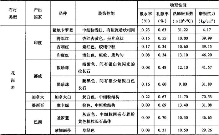 表15-17 常见进口花岗岩产品的装饰性能和物理性能