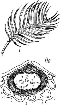 图10-11 苏铁斑点病 1.症状 2.分生孢子器及分生孢子 【病原】 苏铁壳二孢Ascochyta cycadina Scalia。分生孢子器球形或扁球形,暗褐色,直径100微米×239微米,突破表皮外露。分生孢子圆筒形或卵形,大小8.1~11.1微米×3.2~4.2微米。近无色或略带浅褐色,中央有1隔膜,隔膜处稍缢缩或无缢缩。 【发病规律】 病菌主要以分生孢子器或菌丝体在被害叶上越冬。次年形成分生孢子,借风雨传播蔓延。在广州地区5~11月均有发生,以8~9月发生较重。高温多雨利于害虫的发生。苏铁栽植在瘦瘠的粘质土壤中或将盆栽苏铁放于日光辐射强烈的水泥地上,都会加重病害的发生。病菌生长发育温度范围为0~35℃,最适温度为28℃左右。 【防治方法】 (1)加强栽培管理。宜选择土层深厚微带酸性砂质壤土种植。加强通风透光;新叶展开时,适当剪除下部老叶;适当增施有机肥,以增强树势,提高抗病力。 (2)发病初期可喷1∶1∶200波尔多液或75%百菌清可湿性粉剂600倍液,或50%甲基托布津可湿性粉剂800~1000倍液,每隔10天左右喷1次,喷药次数视病害情况发展而定。 |