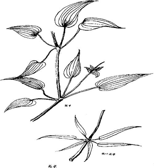 | 释义 | 茜草 茜草的根外观黄红色,自古为红色染料的原料。因而,古代诗文中,茜常与红色同义。茜,又作蒨,古书中的蒨草、蒨藤均指同一植物。在别名中,与红有关的有:染绯草、红茜、红丝线、红根草、红根藤、染蛋草、染卵草、红髻巾、四方红根子、红龙须根、红根子根、地血、金线草、小女儿红、地苏木;又以其为重要的止血、活血中药而名为:血见愁、活血丹、小活血龙、土丹参、活血草、破血草、破血丹、血茜草、铁血藤等;因其茎蔓四棱,有细小倒生刺,而名为拉拉秧、拉拉藤(与葎草同名)、拈拈草、涩涩草、锯锯草、大锯锯藤、粘蔓草、五爪龙、四轮草、四方红根子、锯子草;其果实为球状红色小浆果,表面或有浅棱,而别名:娘娘拳头、小孩拳、娃娃拳、麦珠子、挂拉豆、鸡子草;此外,还有不少别名:过山龙、牛蔓、西天王草、八仙草、穿骨草、山龙草、大仙藤、草本入骨丹、鸭蛋藤、牛人参、红蓝(与草红花同名)、茹 叶四片轮生,卵状心形或狭卵形,全缘。花细小,淡黄色。全国原野、林边、灌丛、田边多有分布,常有时与葎草混生。同属植物有多种,都作茜草使用。一般以根入药,晒干用。 (图:茜草)