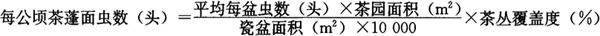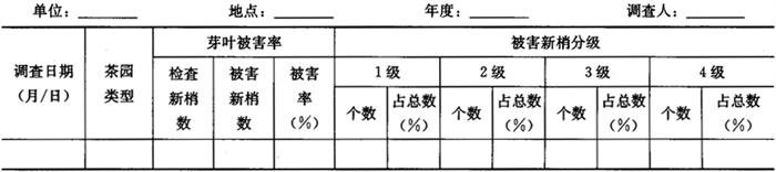 1.2.2 检梢数虫法(百梢虫数) 适用大叶种茶树调查。取样、调查时间和次数,均与检叶数虫法相同。 选择一芽二、三叶新梢为对象,迅速数清整个新梢上的成虫和若虫数,记录于表8-34。 1.2.3 盆拍法 取样方法同检叶数虫法。调查时间宜在晴天,全天均可进行。调查方法、记载项目与越冬调查办法相同。 1.3 新梢被害率及被害程度调查 在每一个虫口密度观察点,用1/3米2的方木框,套在茶丛采摘面上,检查新梢总数和被害新梢数,并按被害程度分级标准统计各级新梢个数,计算各级新梢占总新梢数的百分率,记入表8-35。 表8-35 新梢被害率及被害程度调查记载表