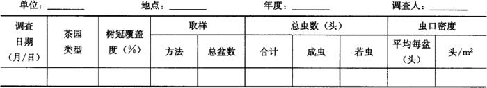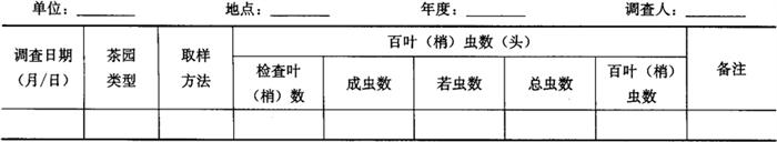 1.2 春、夏、秋、冬虫口密度调查 1.2.1 检叶数虫法(百叶虫数) 适用中、小叶种茶树调查。根据当地主要类型茶园,选择有代表性地块(每调查地块面积以667m2左右为宜),以5点取样或隔行跳跃式取样,每点调查叶片不少于100片。在春夏秋季每5天调查1次。晴天露水未干时调查,阴雨天则全天都可进行。在新芽叶长出之前,查上年留下的叶片;芽叶生长季节,查当年生长的嫩叶(一般查芽下第二叶,或对夹第二叶);采茶结束以后,查当年留下的新叶。记录调查总叶片数和成虫数、若虫数于表8-33。 表8-33 假眼小绿叶蝉越冬虫口密度调查记载表