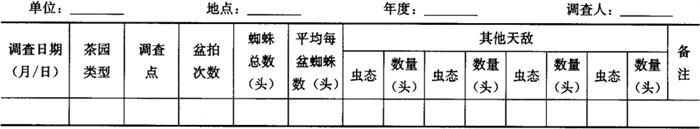 被害新梢分级标准 ◆0级:芽叶生长正常,未受害; ◆1级:受害芽叶呈现湿润状斑,晴天午间芽叶出现凋萎状,夜间、清晨、雨天能恢复正常; ◆2级:红脉期,叶脉叶缘红色转深,并逐渐向叶片中部扩散,叶尖叶缘逐渐卷曲,形成焦头、焦边,芽叶生长停滞; ◆4级:枯焦期,焦头焦边不断向全叶扩张,至叶枯焦,甚至脱落,如同火烧。 1.4 天敌调查 目前着重进行蜘蛛总量调查。可用盆拍法(方法同越冬基数调查),按表8-36内容调查记载。 表8-36 茶园天敌调查记载表