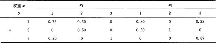 2.2 第二峰发生趋势预测 第二峰发生趋势可采用列联表法来预测。影响因子有7月份的温雨系数(x1=7月份降雨总量÷7月份平均气温)和8月份降雨量(x2)。因素的分级标准如下: x1 1级:<5;2级:5~10;3级:>10。 x2 1级:<100mm;2级:100~140mm;3级:>140mm。 y 1级:为害轻;2级:为害中等;3级:为害重。 x对y影响的权重如表8-38。应用时只要将当地的影响因子数值的对应级,在表8-38中找出对yi的贡献数值相加,数值最大者即为预报级。 表8-38 x对y影响的权重贡献