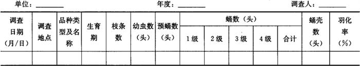 1.2.2 发育进度调查 1.2.2.1 调查时间 调查时间为幼虫盛末期至蛹高峰期,每代调查1~2次。 1.2.2.2 调查方法 选择当地有代表性的早、中、迟熟品种果园各1个,每个果园采用对角线5点取样,每点定点调查1株,每株按东、南、西、北4个方位,每个方位查5~10个枝条和剥检果50个。调查幼虫数、预蛹数、各级蛹数及蛹壳数,调查总虫数应达到50头以上,如不能达到要求,则每点调查2株或以上,计算羽化率。结果填入表7-97。 表7-97 荔枝蒂蛀虫发育进度调查表