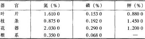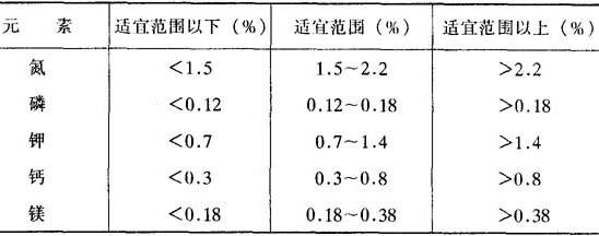 *适宜量范围占180个样测定值的74%~86%。 梁子俊等(1984)在福建南安西林对低丘红壤12年生“陈紫”不同施氮量的叶片氮量分析测定并结合叶片色泽、新梢抽发等生育表现进行综合诊断结果认为:以树冠中部秋梢枝条第二变叶做为取样部位,其叶片含氮1.5%~1.7%,是荔枝氮素适量的营养指标。林可涛(1983)于荔枝花谢后10天测定叶片中养分含量状况,认为这期间叶片钾含量高低与坐果率有密切关系,当叶片钾低于1.66%(或钾<2%)时不能坐果。另据广西北流荔枝场观测,丰产荔枝的叶片氮为1.76%~1.78%、磷为0.254%~0.273%、钾为0.75%~0.92%。吴定尧等(1983)指出,老熟秋梢叶片钾含量0.4%为缺钾。 |