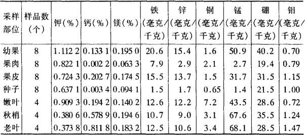 *以株年施N0.5千克、P2O50.5千克、K2O1.5千克为例。 吴定尧等(1985)对19年生“淮枝”不同器官及部位的矿质元素测定结果表明(表6-21),氮、钾、硼、钼在“淮枝”鲜果的果肉、果皮、种子三部分含量分配相对比较平衡。而磷的48.7%和铜的48%集中分布在果肉内。果皮除含有全果约1/3的氮、钾、硼、钼外,镁的49.6%、钙的97%、锰的88%、铁的61%、锌的73.6%都集中在果皮中,而果皮含水量只占全果水分的17%,这一特点说明荔枝果皮是各种元素集中分布的部位。 表6-21 “淮枝”不同器官部位矿质元素含量(干物质平均)