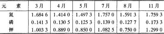 *采样期,幼果5月29日,成熟果实7月2日。K用火焰光度计、其它元素用I.C.P测定。 另据倪耀源(1986)测定,幼果中以氮含量最高,与本测定结果联合起来比较,则幼果中氮>钾>镁>钙,嫩叶中氮比钾含量高2.75倍,比磷高8.4倍,还含有较高的钙、镁等元素;而在秋梢老叶中,除氮含量最高外,钙是仅次于氮的第二大元素,再次为钾、磷、镁;微量元素中以锰、硼较多地集中在梢叶中,铁、锌含量亦相当高,说明每年几次嫩梢抽发,需要多种元素的全面供应。 2.叶片养分含量变化动态 一般而言,叶片能较敏感地反应树体的营养状态,通过叶片营养成分分析来了解树体的营养成分变化动态,为制订施肥措施提供参考是常用的一种研究方法。 梁子俊等(1984)对生长在瘦瘠的低丘红壤土12~18年生“陈紫”荔枝树,在施中量肥(株年施氮0.5千克、磷0.5千克、钾1.5千克)的条件下,连续4年每年于3、4、5、6、7、8、11月份取树冠中部秋梢第二复叶的第二对小叶片测定其叶片中氮、磷、钾含量动态变化(表6-22),结果表明:叶片中氮、磷、钾含量随不同生育期而呈波动状态,在年周期中以开花、幼果肥大期树体养分消耗最大,此期叶片中养分处于低值期,其中4月份由于开花和随后的大量落花,叶片氮含量降到最低值,5月份开始回升;叶片中磷和钾开花后也随之下降,并在5月份的幼果形成期的大量需要进一步下降到最低值。至7月份果实采收后,树体养分消耗得以遏制,此期叶片中氮、磷、钾都得到回升,至8月份由于抽发新梢的养分消耗,叶片中氮磷钾含量又都再次下降,其中钾含量降到低于花果发育期,成为最低点,说明新梢抽发消耗树体大量的钾。至新梢花芽分化前的11月份,叶片氮磷钾又都得以恢复积累并达到最高点,冬季是一年中树体养分最高最稳定的时期,蓄积充足的营养迎接来年花果发育之所需。 表6-22 “陈紫”荔枝不同月份叶片三要素变化情况(%) (梁子俊等,1984)