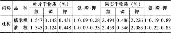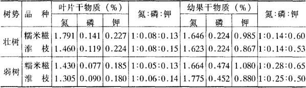 从上述叶片养分含量动态变化不难看出,栽培上应在荔枝开花、果实肥大和秋梢抽发3个叶片养分低植期之前采取施肥措施、补充树体的养分消耗。 3.果实发育期叶片,果实养分含量与比例 荔枝果实发育期树体养分消耗大于积累,即是养分补充的关键期,也是决定产量的关键期。因此,进一步更详细地测定这一时期树体的养分状况乃十分有必要。 倪耀源(1986)测定了幼树与成年树、生长键壮与长势较弱的“糯米糍”与“淮枝”果实发育期间不同物候期的叶片与果实的氮磷钾含量,其结果从氮、磷、钾含量水平看:幼果期两个品种的叶片中氮磷钾均是壮树高于弱树,同一树势一般为“糯米糍”的含量高于“淮枝”(表6-23)。而幼果中氮磷钾含量与叶片的情况正相反,两个品种均是弱树高于壮树,尤其磷含量弱树比壮树高一倍多,同一树势一般也是“糯米糍”高于“淮枝”。对这一现象的解释,认为是弱树的幼果结实量少,叶片营养转移到果实中积存的相对量较多之故。从氮磷钾比例看:同一品种、壮树与弱树叶片中氮、钾比例很接近,而磷则不然,壮树叶片磷占的比值高,弱树占的比值低,而幼果中则是弱树占的比值高,壮树低。但两个品种、两种树势、幼果期的叶片和幼果中均以氮含量和所占的比例最高,钾其次,磷最低,说明荔枝幼果期以需氮最多,钾其次。 表6-23 不同品种幼果期叶片与幼果养分含量比例 (倪耀源等,1986)