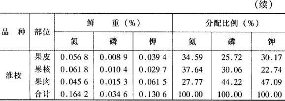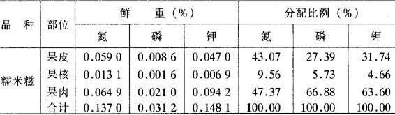 对果树不同部位的氮磷钾含量与分配测定结果得知:由于种子发育程度不同,鲜果各部位氮磷钾含量比例发生了有趣的变化(表6-25),因为“糯米糍”品种种子败育而形成焦状果核,所以,两个品种果皮的氮、磷、钾含量相差不大,而果核与果肉中含量相差却很大。“糯米糍”果核中氮磷钾占全果的比例分别只有9.56%、5.73%和4.66%,而“淮枝”则分别为37.64%、30.06%和22.74%。果肉情况正相反,果肉肥厚的“糯米糍”鲜果肉氮、磷、钾分别占全果的47.37%、66.88%和63.6%,而大核肉薄的“淮枝”分别只占27.77%、44.22%和47.09%。测定结果还得知,荔枝果实成熟时氮主要在果皮和果核中,磷钾主要在果实中,说明了在果实皮核发育的前中期要注意氮的供给,而在中后期果肉肥大时要注意磷钾的供给,尤其钾的供给不可少。 表6-25 荔枝鲜果不同部位三要素含量与分配比例 (仿倪耀源,1986)