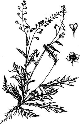 〔形态特征〕 越年生或一年生草本,高20~50厘米。全株稍有分枝毛或单毛。茎直立,有分枝。基生叶丛生,叶片大头羽状分裂,裂片常有齿,具长柄;茎生叶互生,叶片狭披针形至长圆形,基部抱茎,边缘有缺刻或锯齿。花序总状顶生或腋生;花瓣白色,4枚,呈十字排列。短角果倒三角形或倒心形,扁平;种子长椭圆形,黄至黄褐色。