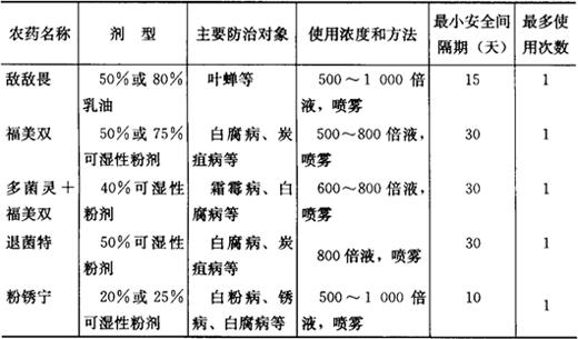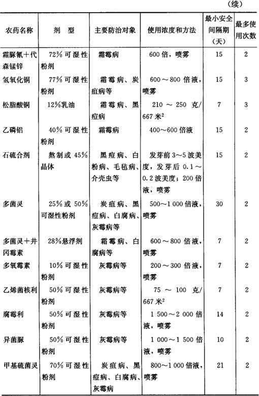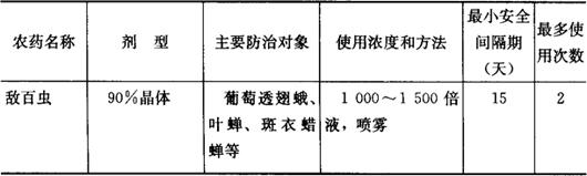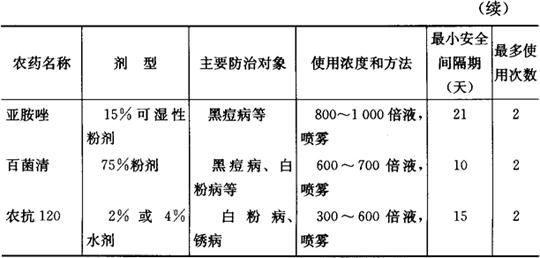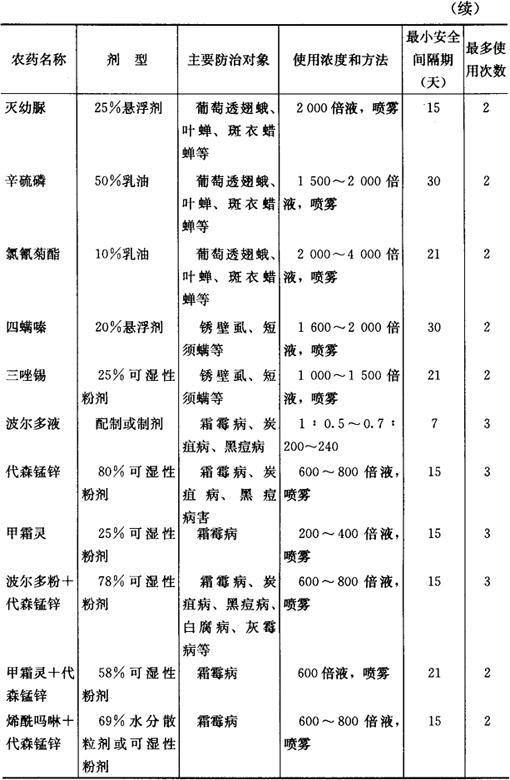③允许使用高效、低毒、低残留农药,微生物源农药及矿物源中的铜制剂和硫制剂。无公害葡萄生产允许使用的农药、使用次数和安全间隔期(最后一次打药距离果实采收的时间)如表15所示。 表15 无公害葡萄允许使用的主要药剂