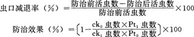 Pt——防治后死亡率% P ck——防治后对照区种群增加或减少百分率 ±——当对照区种群增加时用“+”;当对照区种群减少时用“-” (2)防治蚜、螨类则以虫口减退率作为药效指标