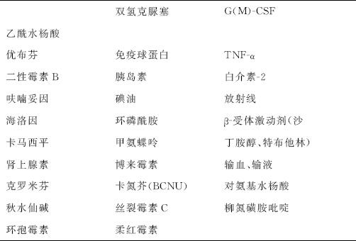 3.气道疾病 (1)支气管痉挛伴(或不伴)喉头水肿:有许多药物可导致支气管痉挛,但机制尚不十分清楚,可大致概括为变态反应、药理反应和直接刺激三方面。青霉素、免疫球蛋白和碘油等可通过变态反应引起支气管痉挛;吸入色甘酸钠和多黏菌素B多通过直接刺激引起;其他多数药物,如β-受体阻滞剂、血管紧张素转化酶抑制剂、非皮质激素类抗炎药、前列腺素E2以及阿司匹林等,则可通过体内药理作用,导致支气管平滑肌收缩,进而引起本症。 阿司匹林导致的支气管痉挛在普通人群中的发生率少于1%,而在稳定期哮喘患者中的发生率可达4%~20%。阿司匹林过敏还可导致荨麻疹、血管水肿、结膜充血和鼻炎。阿司匹林过敏、哮喘和鼻息肉被称为阿司匹林三联症。一些支气管扩张剂和抗炎药通过定量吸入器或雾化吸入时也会导致支气管痉挛,这可能与氯氟碳抛射剂、溶解剂及稳定剂等有关(见表5-9)。 (2)咳嗽:能引起单纯咳嗽的药物主要有血管紧张素转化酶抑制剂、白介素-2、甲氨蝶呤、链激酶和激素。其作用机制尚不清楚。 表5-9 能引起支气管痉挛的药物