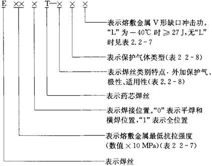 注:1.应分析表内列出值中的规定元素。 2.表中所列单个值均为最大值。 表中 ①这些元素如果是有意添加的,应进行分析并报出数值。 ②只适用于自保护焊丝。 ③该值不作规定,但应分析其数值并出示报告。 ④该类焊丝有意添加的所有元素总和不应超过5%。 2.低合金钢药芯焊丝的型号 根据GB/T 17493-1998《低合金钢药芯焊丝》标准规定,其型号表示方法如下:
