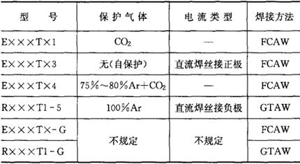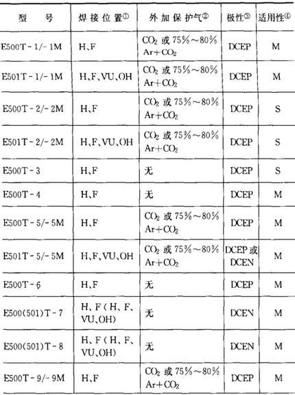 ③这些型号主要用于单道焊接而不用于多道焊接。因为只规定了抗拉强度,所以只要求做横向拉伸和纵向导向弯曲试验。 表2.2-8 碳钢药芯焊丝焊接位置、保护气体类型