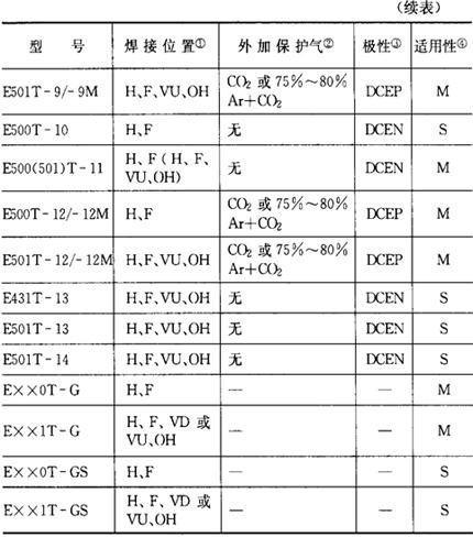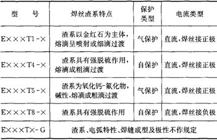 注:①除另外注明外,表中所列单个值均为最大值。 ②只用于自保护焊丝。 ③对E×××T×-G型号,只要列出的合金元素中任何一个满足最小值要求,即认为该型号化学成分满足要求。 表2.2-11 低合金钢药芯焊丝的渣系、保护类型及电流类型