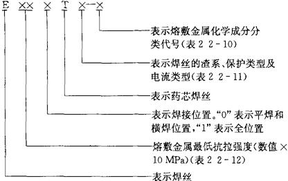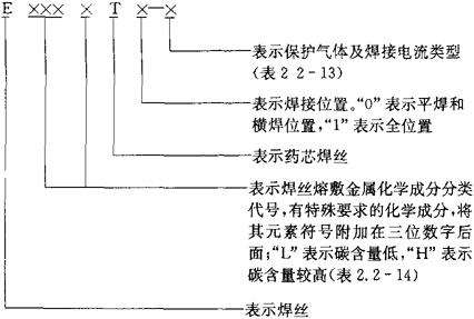 | 释义 | 药芯焊丝 1.碳钢药芯焊丝的型号 根据GB/T 10045-2002《碳钢药芯焊丝》规定,其型号表示方法如下:
