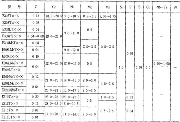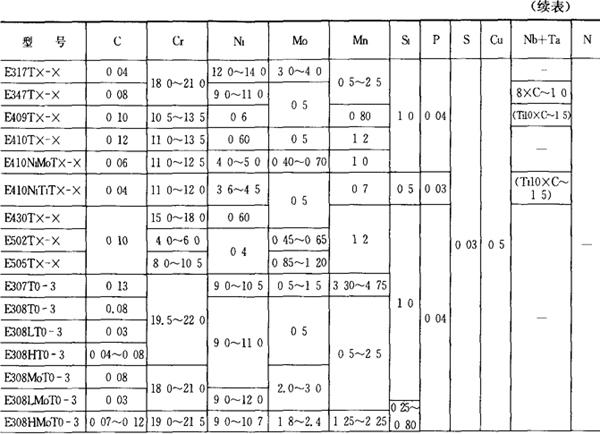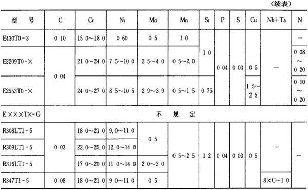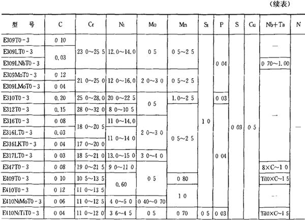 注:FCAW为药芯焊丝电弧焊;GTAW为钨极惰性气体保护焊。 表2.2-14 不锈钢药芯焊丝熔敷金属化学成分(%)