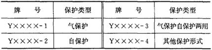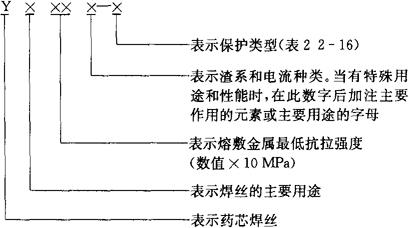 注:①加热到730~760℃保温1h后,以不超过55℃/h的速度随炉冷到315℃,出炉空冷至室温。 ②加热到595~620℃保温1h,出炉空冷到室温。 ③加热到760~790℃保温4h后,以不超过55℃/h的速度随炉冷到590℃,出炉空冷至室温。 ④加热到840~870℃保温2h后,以不超过55℃/h的速度随炉冷到590℃,出炉空冷至室温。 (二)药芯焊丝的牌号 根据《焊接材料产品样品》规定,药芯焊丝的牌号表示方法如下: