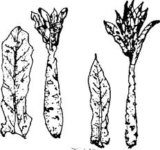 图27-1 茎用莴苣 左:杭州杼子种;右:杭州笔杆种 (1)杭州尖叶莴笋 又名笔杆种,杭州地方品种。株高40-45cm,开展度35cm左右。叶披针形,绿色,叶缘波状,叶上半部平滑,下半部皱缩。茎长21-27cm,横径4cm,棍棒形,皮和肉淡绿色,茎重175-200g。早熟种,耐寒。抗病性中等。肉致密,品质中等。宜密植。亩产1500kg左右。上海细尖叶莴笋与本品种性状相似。 (2)杭州圆叶莴笋 又名杼子种,杭州地方品种。株高45-50cm,开展度38cm左右。叶尖椭圆形,浅绿色,微皱。茎长25-30cm,横径5cm,形似纺线的杆子,浅绿色,重0.2-0.25kg。抗病,耐寒,晚熟。品质好。亩产1750kg左右。 (3)南京白皮香 又名鸭蛋头,南京地方品种。叶长椭圆形,先端尖,叶面皱缩。茎皮和肉都是绿白色。早熟。抗霜霉病。品质好。 (4)南京紫皮香 南京地方品种。叶宽大,皱缩,青绿色,有紫色晕或全紫红色。茎皮青带紫色条纹,肉青色。品质好。抗霜霉病。为中晚熟种。 (5)南京青皮臭 又名竹竿青,南京地方品种。叶披针形,叶面微皱缩。茎皮和肉青色。迟熟丰产。抗霜霉病。外皮纤维较多,肉致密而脆,为主要加工品种。 (6)上海大圆叶 上海地方品种。叶宽而圆,皱缩。茎粗大,皮白绿色,肉绿白色。抽薹迟。 (7)上海大尖叶 上海地方品种。叶长而宽,边缘波状,叶多而密,淡绿色。茎肥大,皮白绿色,肉浅绿色。晚熟种,抽薹迟。 (8)孝感莴苣 湖北省孝感县地方品种,武汉市郊区栽培较广。株高50cm左右,节间较密,叶形呈倒卵形,似宝剑头,叶全缘或浅波状,叶背中肋突起,叶面近中肋处皱缩,叶色绿,叶中上部叶缘呈淡紫色,中肋淡绿色,叶略开张。肉质茎长圆柱形,中下部较粗,先端较细,长约40cm,粗4.2cm,皮色绿,节间略带紫色,肉色绿白。品质较佳,耐寒性较强,秋季或越冬栽培。 (9)竹蒿莴笋 湖南地方品种。圆叶种,叶面皱缩。茎细,长约1.5尺。耐热性强,不抗霜霉病。早熟种。 (10)锣锤莴笋 湖南地方品种。圆叶种,叶面皱缩。茎下大上尖,长约8寸。品质好,产量高。中熟种。 (11)白叶莴笋 湖南地方品种。圆叶种,叶色黄绿。茎长约25cm。品质好,产量较高。晚熟种。 (12)大尖叶莴笋 湖南地方品种。尖叶种,叶长而宽,边缘波状。茎长25-30cm。晚熟种。 (13)二白皮密节巴莴笋 成都地方品种。叶直立,倒卵圆形,浅绿色,叶面微皱。茎粗,节密,皮草白色,肉浅绿色。品质好。耐热。不易抽薹。 (14)草白莴笋 又名青麻叶或成都杆。成都地方品种。叶少,直立,披针形。茎粗,节密,皮绿色。品质好,产量高,适应性强。抽薹晚。晚熟种。 (15)万年椿 重庆地方品种。叶直立,披针形,淡绿色。茎粗,上下一致,节密,皮淡绿色,肉绿色,品质好,产量高。抽薹晚。晚熟种。 (16)白甲莴笋 重庆地方品种。有尖叶和圆叶两种,圆叶种又名马耳朵。叶淡绿色,叶片多,叶下茎部自然化为白色,茎粗,节密,皮淡绿色,肉略带黄色,品质好。晚熟种。贵州的尖叶白甲是四川引进的。 (17)红莴笋 重庆地方品种。叶长圆形,叶略带紫红色,叶面皱缩。茎紫红,节稀,肉翠绿色,品质好。早熟种。 (18)双尖莴笋 贵州地方品种。叶披针形,绿色。抽薹时茎尖分化为两个生长点,微弯曲。抽薹迟。耐热。中熟种。 (19)罗汉莴笋 贵州地方品种。叶尖端圆。茎呈棍棒形。适应性强。抽薹迟。晚熟种。 2.叶用莴苣 叶着生短缩茎上,叶色浅绿色或深绿色或紫红色,叶面平滑或皱缩,边缘有缺刻(图27-2)。不结球的称散叶莴苣,结球的称结球莴苣,又可分为下列三种: