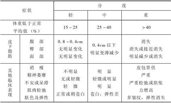 | 释义 | 营养不良 营养不良又称蛋白-能量不足性营养不良,即蛋白质和能量的供给均缺乏,但两者不能截然分开。本病主要由于营养素的摄入不足,消化、吸收、利用障碍,需要量或消耗量增加,以及其他由于生活环境不良,缺少爱抚,精神抑郁,饮食单调等引起。多见于3岁以下的婴幼儿。由于蛋白质、能量不足,迫使机体消耗自身组织,从而出现生长发育迟缓、停滞,行为、心理和学习能力等的改变和各系统功能的紊乱。 【诊断】 1.病史 多有长期喂养不当或(及)患寄生虫病等慢性疾病史。 2.临床表现 体重不增或减轻是最早出现的症状,病久者,皮下脂肪逐渐消失。皮下脂肪消减的顺序自腹部开始,依次为胸、背、腰、四肢及臀部,最后为面颊部。 3.营养不良的类型 根据疾病的严重程度,可将营养不良分成轻、中、重Ⅲ度,按临床表现不同,营养不良又可分为3型。 (1)消瘦型:能量和蛋白质均不足,但以能量缺乏为主。其特点为皮脂薄、肌肉少、老人脸、骨瘦如柴、无水肿。实验室检查血浆总蛋白和白蛋白正常。肝脏无病理改变。 (2)水肿型:能量摄入相对不足,但蛋白质严重缺乏。其特点为长时期的负氮平衡,血浆蛋白减少,胶体渗透压降低,出现全身的水肿。临床除有水肿外,还伴有毛发稀疏、干燥、失去光泽,黑发变成红棕色,皮肤色素沉着或脱屑、溃疡,皮炎与脂肪肝等表现。 表4-1 小儿营养不良分度标准