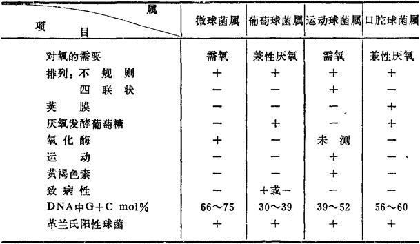 | 释义 | 葡萄球菌属 葡萄球菌属,属微球菌科(Micrococcaceae)。本科为革兰氏阳性球菌,直径为0.5~2.5μm,排列不规则,需氧或兼性厌氧,化能有机营养,能在10%、有的还能在10%~15%的NaCl中生长,下分四属,微球菌属(Micrococcus)、运动球菌属(Planococcus)、葡萄球菌属、口腔球菌属(Stomatococcus),其区别见表10-1。其中与兽医微生物较密切的是葡萄球菌属。本属有20个种,可用下法检索。 表10-1 微球菌科四属比较