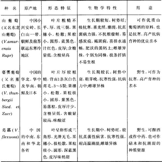 二、东亚种群 它起源于东亚广大地区,至今仍为野生,分布在森林、河流、山谷等地。该种群抗旱、抗湿性、抗病力与适应性均较强。它们共有40多个种(其中我国有10余种),多数尚未利用,我国对山葡萄等少数几个种作了较系统的研究,并利用它们进行新品种培育已获得成功,如北醇、公酿一号等。其他国家也十分重视这方面的工作并取得良好效果。原产中国东亚种群主要种的起源、特点、用途等如表1-1-2所示。 表1-1-2 东亚种群主要种的特性与特征