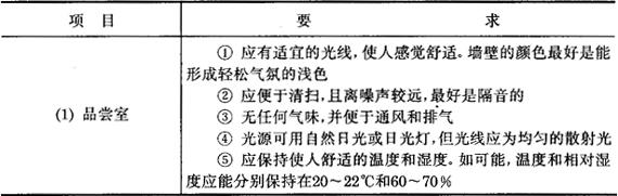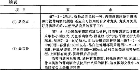 一、对葡萄酒感官分析人员的要求 (1)思想作风正派、大公无私、实事求是、认真负责。 (2)熟悉葡萄酒的类型和葡萄酒的生产工艺、品种。 (3)身体健康,有一定的酒精适应能力。 (4)对葡萄酒类产品具有较强的品评能力。 二、对感官分析环境的要求 表7-2-5 对感官分析环境的要求
