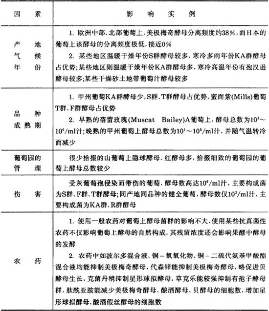 二、葡萄和鲜葡萄汁中酵母的分布 大量的研究结果表明,葡萄上酵母菌的种类、构成比和菌数,受产地、风土、气候、年份、葡萄品种、成熟期、葡萄园的管理状况、葡萄受伤受害程度、农药使用情况等种种因素错综复杂的影响,表2-1-5列举了一些因素的影响实例。 表2-1-5 各种因素对葡萄(葡萄汁)的酵母菌生态分布的影响实例