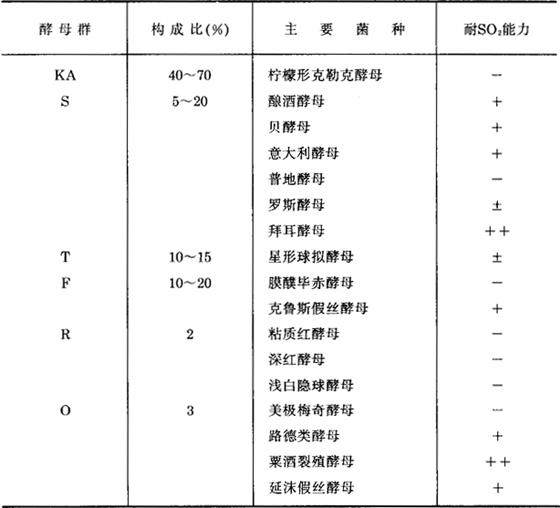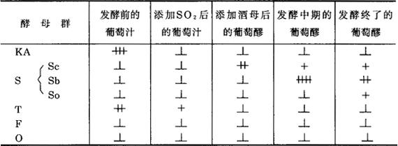 注:(1)Sc添加的酿酒酵母,Sb贝酵母等,So其他的酵母属酵母。 (2)葡萄汁糖度约24g/100ml,添加SO250~100mg/L,加酒母1%,发酵温度20℃,发酵约14天结束。 |