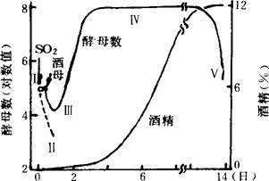 三、葡萄汁(浆)发酵过程中酵母的消长 原料葡萄经破碎压榨后,葡萄汁中的酵母总数一般平均在105~106/ml,由此开始便进入发酵阶段。根据SO2添加与否,添加量多少,是否添加纯培养酵母等,发酵过程中酵母菌群的消长情况有所不同(见图2-1-3,图2-1-4)。