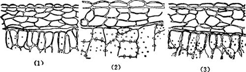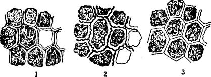 图7-8 在从上面看时,洋葱(玉葱)、韭葱、葱的种皮构造的区别 1.洋葱(玉葱);2.韭葱;3.葱 (菲尔索娃,1956) 从纵切片看,洋葱种皮的表皮细胞为多面形,外形稍带波浪状;韭葱种皮的表皮细胞的外形呈明显的波浪状(2);葱种皮的表皮细胞同样为多面形,但较伸长,其外形较洋葱的外形的波纹少些(3)。 为了制作横切片,须将种子湿润,装入滤纸袋中,置有水的干燥器中放24小时。此后,再将种子放入96%酒精中24小时使其脱水。以后将脱水种子埋入石蜡块,用切片机切下厚度为35-50μm的切片。由于葱类种皮沉积着色素,有时很难使种子的横切片不带有颜色。为了去色,可将种子先放入20%若维耳水中浸48小时,并为了使细胞更清楚可见,再用苏木素染色3-5分钟,随后制片。 鉴别时将切片放在85-350倍的显微镜下观察。 从横切片(图7-9)看,洋葱种皮的表皮细胞很长,具有弓形凸起的很薄的细胞外壁。由于表皮细胞的内细胞壁直接与薄壁组织细胞的第一层连接起来,因而表皮细胞与薄壁细胞的外壁合并。胚乳由细胞壁显着加厚的大细胞所组成。根据贯穿相邻两细胞的细胞壁的孔道,可判细胞壁的增厚情况。这些孔道会合于一点,当从表面观察时,则呈杯状或点状(1)。