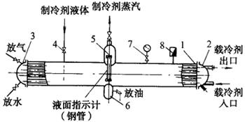 | 释义 | 蒸发器 蒸发器的作用是使低压、低温制冷剂液体在沸腾状态下,在蒸发过程中吸收被冷却的介质热量,从而达到制冷的目的。 (一)卧式壳管蒸发器 图4-13-10为满液式卧式壳管蒸发器,基本上是一种列管式换热器,制冷剂在壳程内流动,载冷剂在管内流动。正常操作时,一般液面高度可用氨浮球阀控制在筒体直径的70%~80%,所以称为满液式。