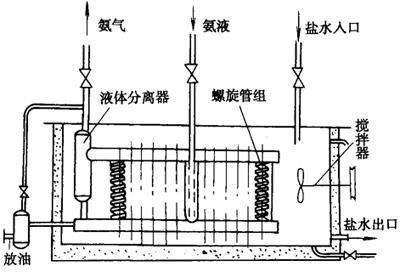 注:大连冷冻机厂制造。 (二)立式螺旋管式蒸发器 立式螺旋管式蒸发器是一种传热效率较高,主要用于氨制冷系统的敞开式蒸发设备,其结构如图4-13-11所示。氨制冷剂在螺旋管内,盐水箱内设有搅拌器,以提高传热效果。表4-13-8为其主要技术参数。