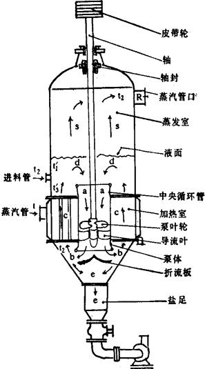 | 释义 | 蒸发结晶 卤水中氯化钠结晶析出,主要依靠加热蒸发除去水分。为提高热能利用率,常采用多效蒸发制盐。 (一)单个效蒸发及温度参数 1.单个效的蒸发过程 以标准型强制循环蒸发罐为例(见图3-4-47),物料在泵叶轮的推动下,沿a-b-c-d-a路线循环,在加热管内c时受热升温,在液面d处蒸发降温,同时料液成过饱和状态析盐,通过中央循环管下降,在锥底b处盐晶因重力沉降进入盐足e。盐浆由盐足排出。在d处蒸发的蒸汽夹带液沫在s处分离液沫,通过R去下一效,作为下一效的加热热源,或被冷却水冷凝。