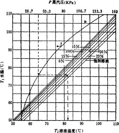 图3-4-48 盐卤的沸点升与压力关系图 使用方法:由P标尺引垂线交参考线R于Z点,过Z点作标尺T2平行线交溶液浓度线,从交点引垂线交T2标尺即为溶液沸点;过Z点的平行T2标尺的线向左延伸交T1标尺即为水的沸点,T2标尺与T1标尺的读数差即为沸点升高温度。 ②不平衡温度损失:蒸发循环过程(参见图3-4-47)物料被加热到t3′,在液面蒸发达到理论热力学平衡时的液面温度t1′=t2+⊿t沸,但物料因受料液流动和静压等动力因素影响,蒸发后料液循环到下花板位置时液温度t2′大于t1′,从而造成的温差⊿t平=t2′-t1′,称为不平衡温差。⊿t平与操作条件、罐型和流动状况有关,约为1~3℃。 ③过热温差损失:盐卤通过加热管温度由t2′升到t3′。⊿t过=t3′-t2′称为过热温度,通常为2~3℃。受热物料平均温度应取t2′与t3′平均值。由此损失的有效传热温度称为过热温度损失,其值为⊿t过/2。 ④单效蒸发的有效传热温度⊿tn