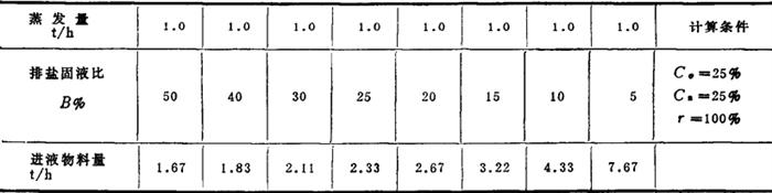 式(3-4-30)的物理意义是:进罐物料量为蒸发量、盐浆量和应排母液量三项之和。在蒸发量恒定情况下,进罐物料量则与盐回收率和盐浆固液比有关。 根据式(3-4-31)计算的蒸发量与进罐物料量的关系见表3-4-41、表3-4-42。 表3-4-41 排盐固液比不同时蒸发量与进料量关系