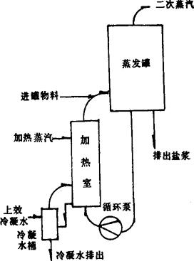 (二)单效蒸发的物料计算 参见图3-4-49。 1.计算条件 (1)卤水中NaCl的初始浓度Co,g/100g; (2)卤水中NaCl的饱和浓度Cn,g/100g; (3)NaCl的析出率或收率r,%; (4)排出盐浆的固液比 (5)若有盐浆转入本效并与本效盐浆-起排出时,转入、转出的盐浆量和母液不发生量的变化,不发生浓缩。 2.计算式(以原卤为基数) (1)浓缩阶段的蒸发水量:Wn′= (2)析盐阶段的蒸发水量:Wn″=r· (3)预定析盐率时的蒸发水量: