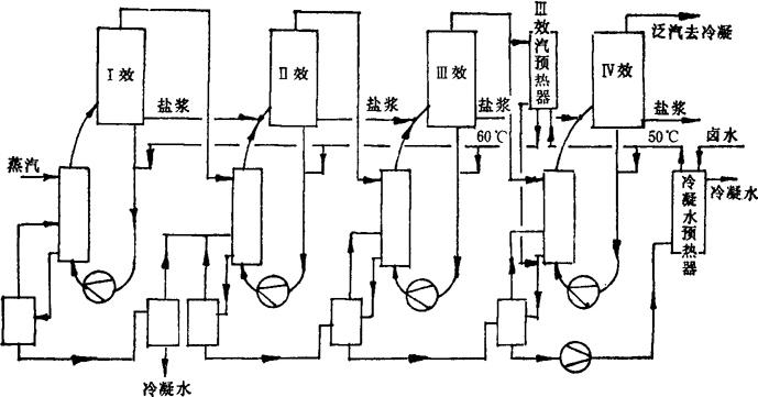 CJ——盐浆的热容,3.2kJ/(kg·℃) Tn-1,Tn——上一效与本效的液温(℃) 4.本效蒸发结晶的热效应: q4=Wn/ 式中 θNac1——氯化钠的结晶热,83.8kJ/kg Wn——本效蒸发水量(kg/h) 5.进入本效的料液升温显热: q5=Sn/Wn×Wn·CL(Tn-To) kJ/h (3-4-38) 式中 CL——料液热容,3.35kJ/(kg·℃) Tn——本效料液温度(℃) To——进料液温(℃) Sn/Wn——由物料计算中根据卤水的情况算出(kg/kg) 6.本效蒸发水所需热量: q6=Wn·in kJ/h (3-4-39) 式中 in——本效条件下水的蒸发潜热(kJ/kg) 7.热平衡方程式 η×(q1+q2+q3+q4)=q5+q6 (3-4-40) 式中 η=1-热损失率 式3-4-40可化为 η〔Wn-1×in-1+W′n-1×(i′n-1-i′n)+ =Sn/Wn×Wn×CL×(Tn-To)+Wn·in (3-4-41) 式(3-4-41)中,η、in-1、i′n-1、i′n,CJ、Tn-1、Tn、θNac1、CL、Tn、T0、in等项均为蒸发的规定性条件或是在规定性条件下物料热力学数据,可视为已知条件; (四)多效蒸发系统流程及工艺计算 1.多效蒸发流程 制盐生产采用多效蒸发流程。因所用原料不同,流程有所差别。目前国内多采用四效蒸发、冷凝水闪发、卤水进行预热的流程,图3-4-50所示为多效蒸发流程示意。