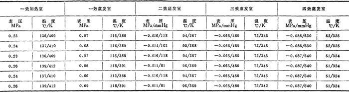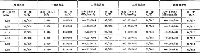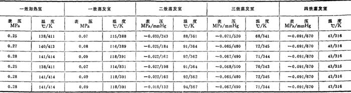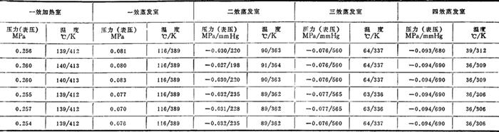图3-4-50 多效蒸发流程示意图 2.多效蒸发系统的温度分配(以四效为例) (1)四效蒸发制盐蒸发系统运行参数实例表3-4-43到表3-4-44是四川自贡地区4个盐厂制盐蒸发设备运行的压力和温度实例。图3-4-51至图3-4-54是根据该4厂蒸发系统运行参数绘制而成的。 表3-4-43 四川自贡某厂年产10万吨制盐蒸发系统运行参数