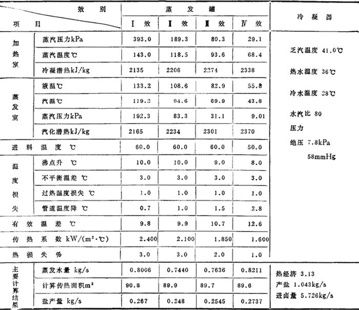 蒸发量 w4=0.8211(kg/s) 四个效合计 3.13(kg/s) 进卤量 S4=1.502(kg/s) 5.726(kg/s) 产盐量 G′4=0.2737(kg/s) 1.043(kg/s) 应排盐浆量