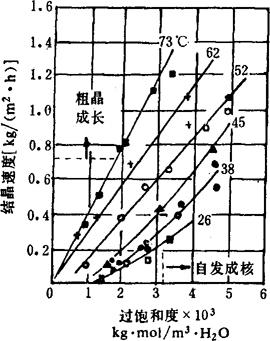 图3-4-56 结晶温度不同时氯化钠过饱和度与结晶速度关系 (3)结晶体个数 循环物料中的晶体个数太多,不利于晶体的生长。 (4)循环速度 过大的循环速度会导致已生成的盐晶破碎,二次晶核大量产生,不利粒径长大。 (5)物料的浓度 杂质浓度高,粘度大,不利粒径长大。 (6)晶体在罐内停留时间 粗粒径盐晶的生成必须有足够时间。据资料介绍,平均粒径0.4mm以上的盐晶,停留时间不应少于1h。蒸发制盐中可通过合理设计蒸发罐和控制运行中物料的固液比来达到必须的停留时间。
