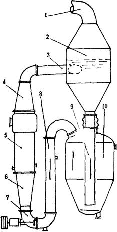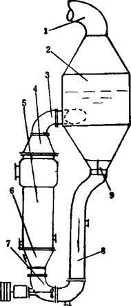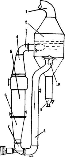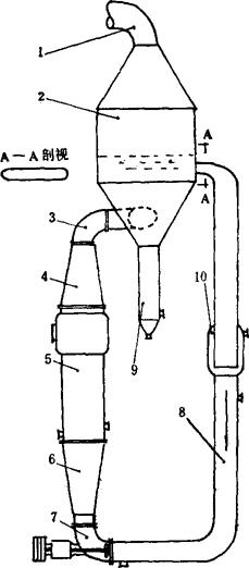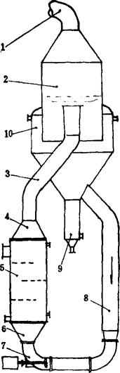 图3-4-59 外热、强循环、轴向流动蒸发罐结晶图 1-二次汽管 2-蒸发室 3-上循环管 4-上锥 5-加热室 6-下锥 7-循环泵 8-下循环泵 9-盐脚 10-排液限流器