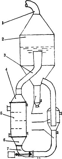 图3-4-58 外加热、强循环、无盐脚蒸发罐结构图 1-二次汽管 2-蒸发室 3-上循环管 4-上锥 5-加热室 6-下锥 7-循环泵 8-下循环管 9-导流板