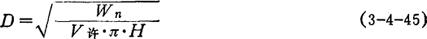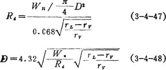 式中 D——蒸发器直径(m) H——蒸发器蒸发空间高(m),通常为2.5~3.0m V许——容许蒸发体积强度,1.1~1.5m3/(s·m3),低压状态取上限值 Wn——蒸发器应蒸发蒸汽量(m3/s) 通常蒸发空间高(H)确定为2.5~3.0m。因为在这种高度时,二次蒸汽从沸腾液体上逸出时所带的液滴大部分已能沉降分离回落。 (2)“许用质量速度法”: Wn=πD2·U许Vn/3600 (3-4-46) 式中 U许——容许的质量速度(kg/m2·h)(每1m2蒸发表面每1h容许的蒸发量) Vn——蒸发工况下,蒸汽的比容(m3/kg) U许与蒸发工况有关。可由图3-4-63中查取。